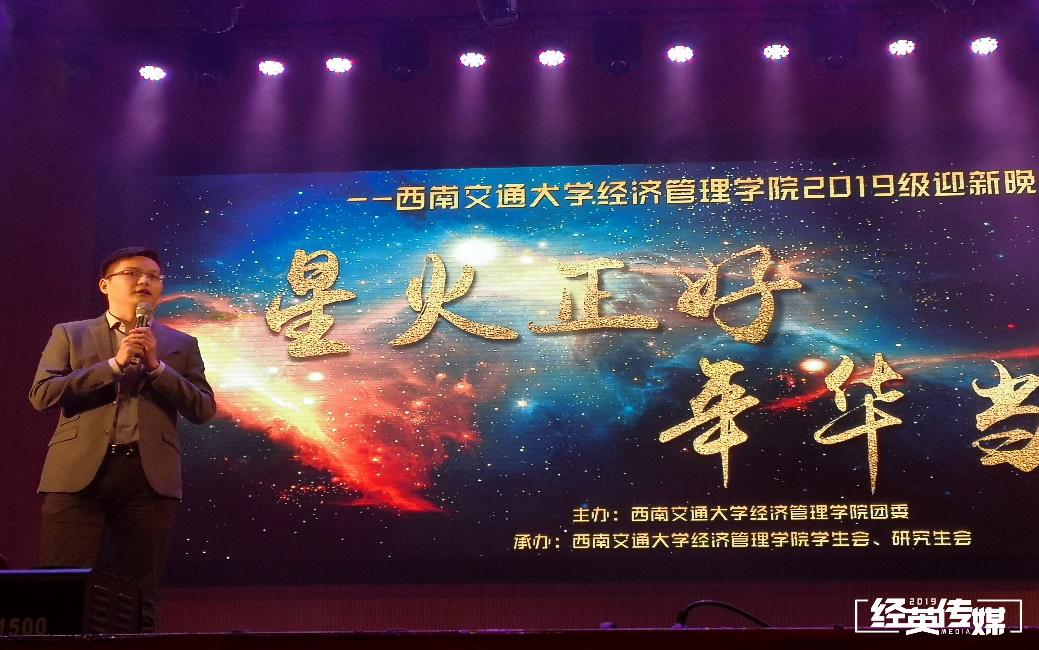 10月21日晚上7时整,西南交通大学经济管理学院“星火正好 年华当时”2019级迎新晚会在西南交通大学九里校区大学生会堂隆重举行。此次晚会由经济管理学院团委主办,院学生会、研究生会承办。出席本次晚会的嘉宾有:经济管理学院党委书记郝辽钢,党委副书记江宇兰、杨宏毅,副院长李良,以及学院教职工代表,各兄弟学院团委书记,学生会指导老师、主席和研究生会主席等。