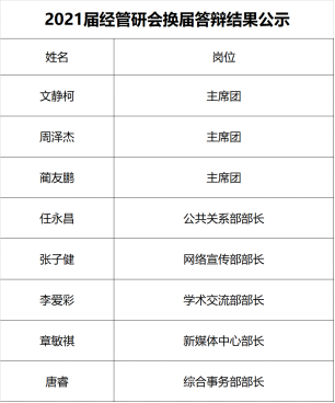 为进一步加强经济管理学院研究生会建设,促进研究生会职能的科学有效发挥,落实研究生会各项工作开展,广泛动员同学参与研究生会工作,组织动员广大青年和青年学生坚定跟党走、奋进新时代。经济管理学院研究生会于2021年6月16日下午15:00举行2021届干部换届答辩,现将经济管理学院研究生会换届结果公示如下: