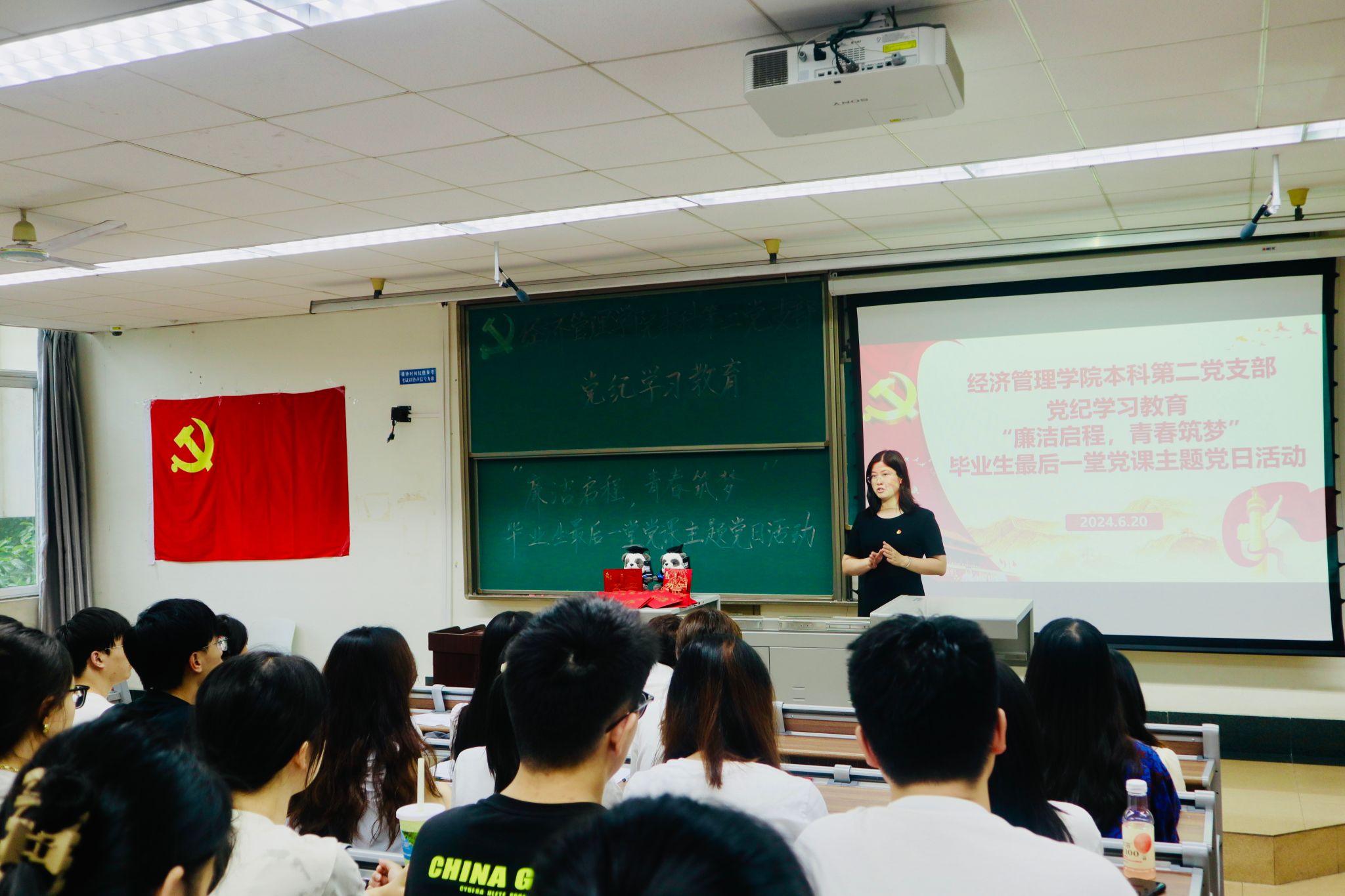 为深入学习贯彻习近平新时代中国特色社会主义思想和党的二十大精神,开展好党纪学习教育,进一步增强毕业生党员的党性意识和社会责任感,6月20日,经济管理学院本科第二党支部于J4310开展党纪学习教育——“廉洁启程,青春筑梦”毕业生最后一堂党课主题党日活动。